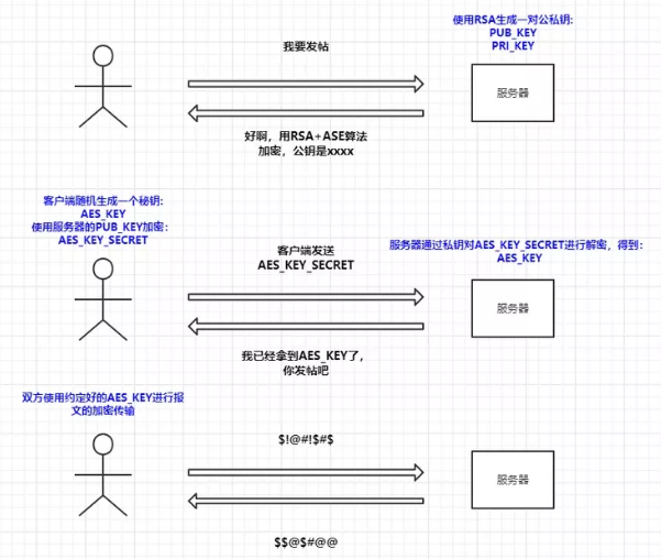 那么对于这种情况,我们肯定就会考虑能不能将秘钥进行加密不让中间人看到呢?答案是有的,采用非对称加密,我们可以通过 RSA 算法来实现。这个步骤实际操作也是比较简单的,在约定加密方式的时候由服务器生成一对公私钥,服务器将公钥返回给客户端,客户端本地生成一串秘钥(AES_KEY)用于对称加密,并通过服务器发送的公钥进行加密得到(AES_KEY_SECRET),之后返回给服务端,服务端通过私钥将客户端发送的AES_KEY_SECRET进行解密得到AEK_KEY,最后客户端和服务器通过AEK_KEY进行报文的加密通讯,改造如下: