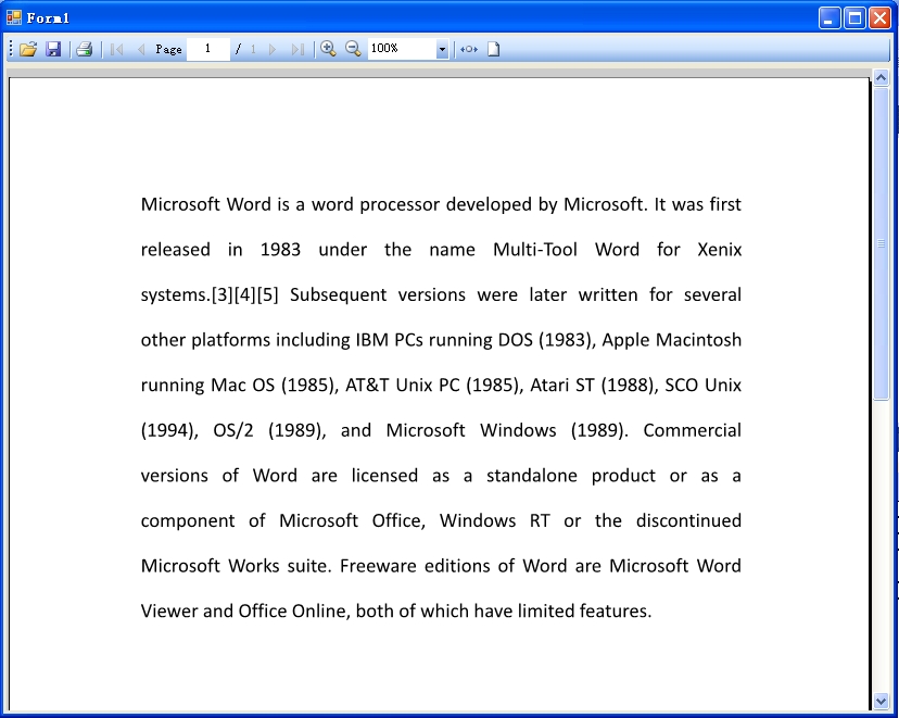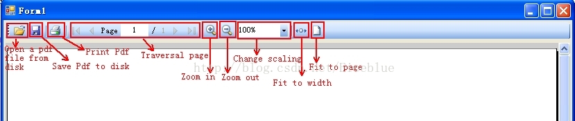 3、我先测试的是PDFViewer控件,它的最上端是个工具栏,里面包含打开pdf文件,保存pdf文件,打印,遍历页数,放大,缩小,调整缩放比例,使页面适应窗体的大小(FitToPage),使页面的宽度适应窗体的宽度(FitToWidth)。