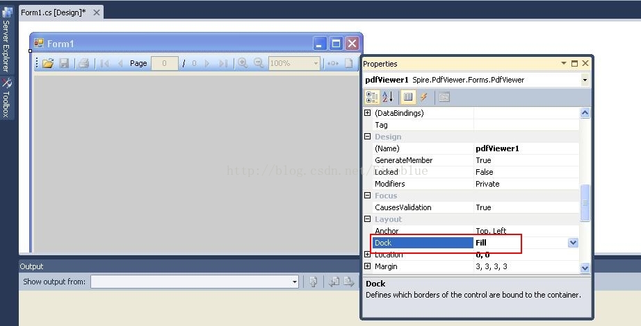 把PDFviewer控件拖到from上,然后设置它的Dock属性为Fill,这样能让它填充整个form窗体。