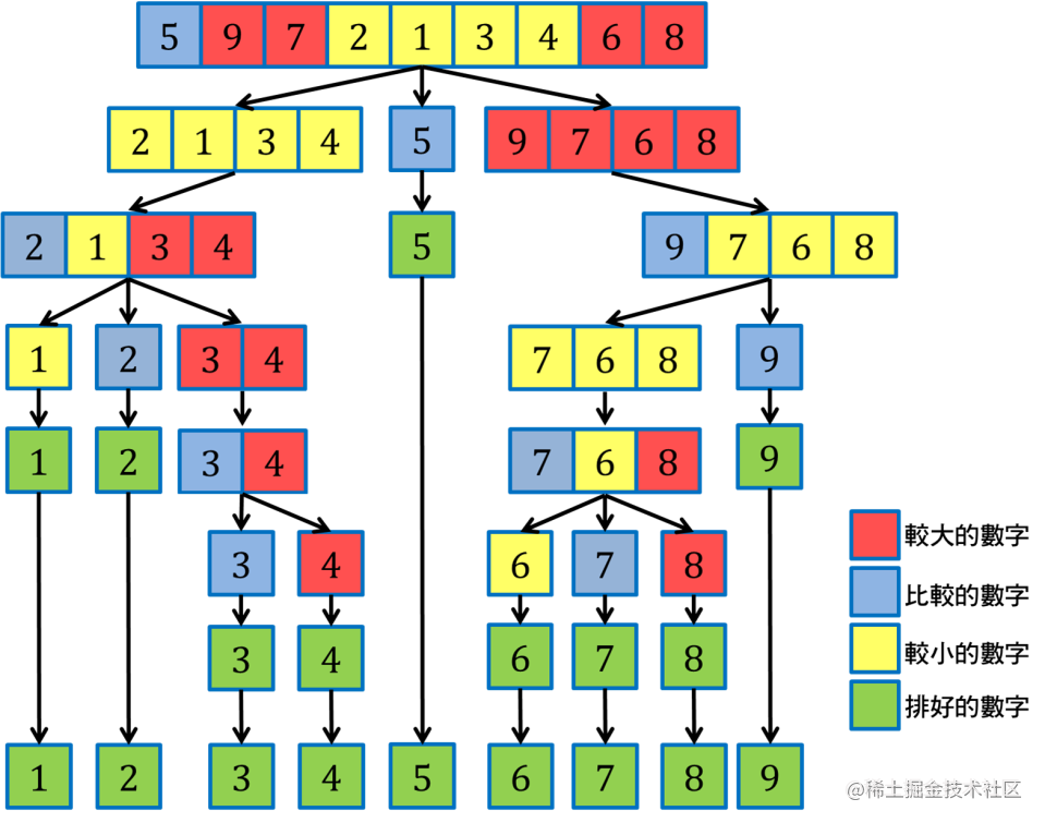 通过选定一个数字作为比较值,将要排序其他数字,分为 >比较值 和 <比较值,两个部分。并不断重复这个步骤,直到只剩要排序的数字只有本身,则排序完成。