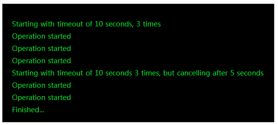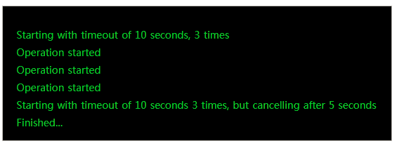 Console.WriteLine("Starting with timeout of 10 seconds 3 times, but cancelling after 5 seconds");