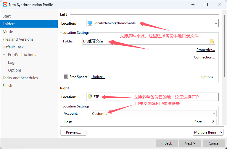 Left:备份来源,Location支持很多种,这里选择本地目录“Local/Network/Removable”,Folder选择准备备份的本地目录;
