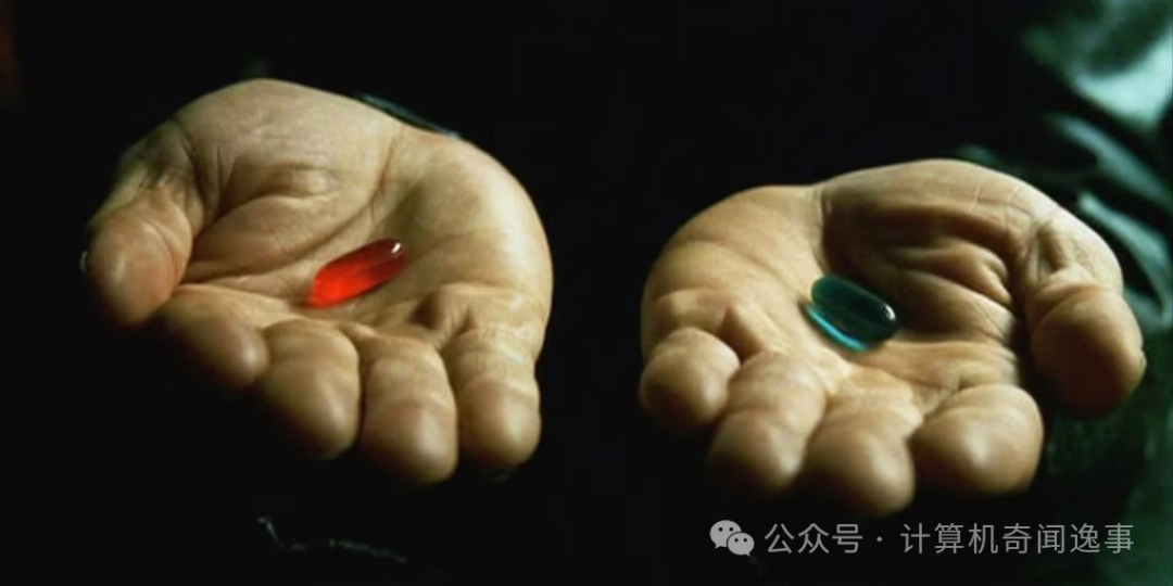 这是电影《黑客帝国1》中的经典场景之一。墨菲斯(Morpheus)邀请尼奥(Neo)做出一个决定,选择红药丸还是蓝药丸——选择追求真相还是沉迷虚假。