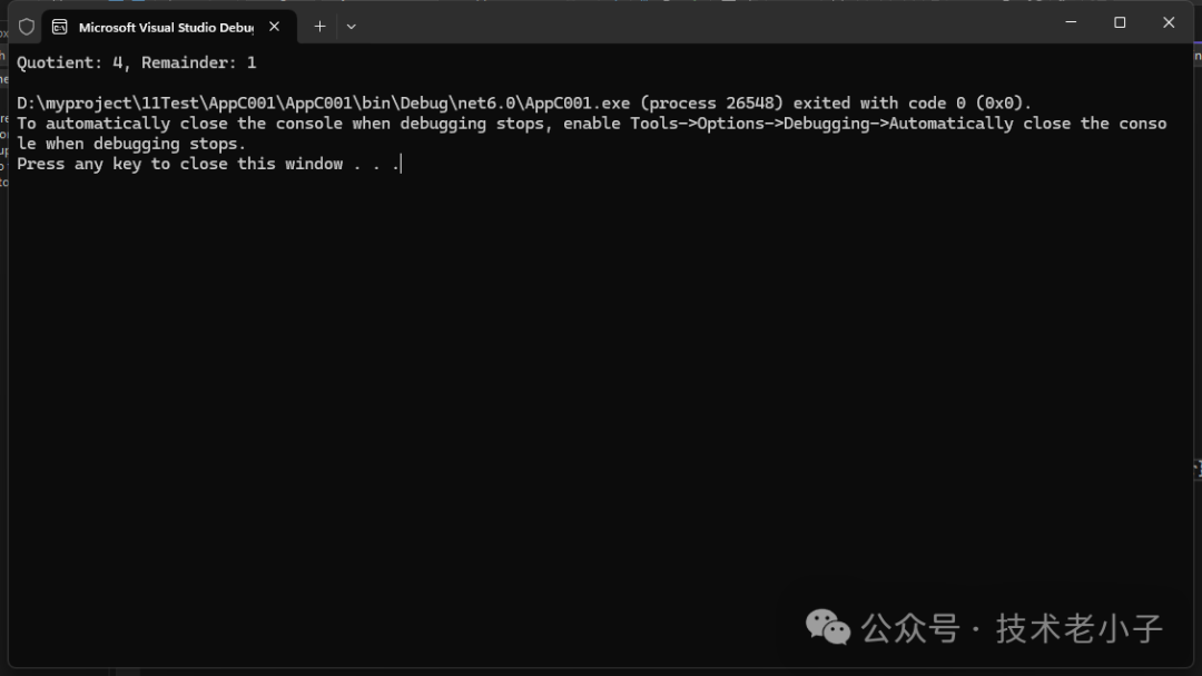 namespace AppC001 { publicclassDivider { // 返回商和余数 public (int Quotient, int Remainder) Divide(int dividend, int divisor) { if (divisor == 0) { thrownew DivideByZeroException("除数不能为0"); } int quotient = dividend / divisor; int remainder = dividend % divisor; return (quotient, remainder); } } publicclassProgram { publicstaticvoidMain() { // 调用方法 Divider divider = new Divider(); var result = divider.Divide(17, 4); Console.WriteLine($"Quotient: {result.Quotient}, Remainder: {result.Remainder}"); // 输出: Quotient: 4, Remainder: 1 } } }