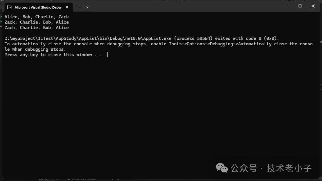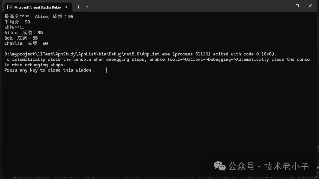 namespace AppList { publicclassStudent { publicstring Name { get; set; } publicint Score { get; set; } } internal classProgram { staticvoidMain(string[] args) { // 创建学生列表 List<Student> students = new List<Student> { new Student { Name = "Alice", Score = 95 }, new Student { Name = "Bob", Score = 85 }, new Student { Name = "Charlie", Score = 90 } }; // 查找成绩最高的学生 var topStudent = students.OrderByDescending(s => s.Score).First(); // 计算平均分 var averageScore = students.Average(s => s.Score); // 找出及格的学生 var passedStudents = students.FindAll(s => s.Score >= 60); Console.WriteLine($"最高分学生:{topStudent.Name},成绩:{topStudent.Score}"); Console.WriteLine($"平均分:{averageScore}"); Console.WriteLine("及格学生:"); foreach (var student in passedStudents) { Console.WriteLine($"{student.Name},成绩:{student.Score}"); } } } }