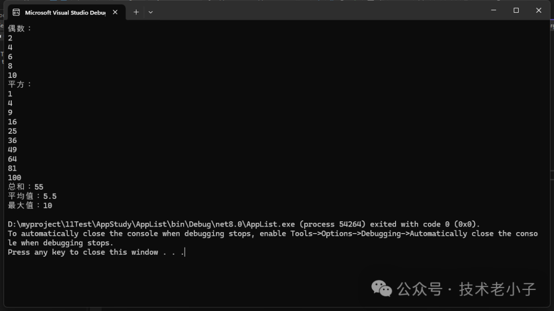 List<int> numbers = new List<int> { 1, 2, 3, 4, 5, 6, 7, 8, 9, 10 }; // 筛选 var evenNumbers = numbers.Where(n => n % 2 == 0).ToList(); Console.WriteLine("偶数:"); foreach (var number in evenNumbers) { Console.WriteLine(number); } // 转换 var squared = numbers.Select(n => n * n).ToList(); Console.WriteLine("平方:"); foreach (var number in squared) { Console.WriteLine(number); } // 聚合 var sum = numbers.Sum(); var average = numbers.Average(); var max = numbers.Max(); Console.WriteLine($"总和:{sum}"); Console.WriteLine($"平均值:{average}"); Console.WriteLine($"最大值:{max}");