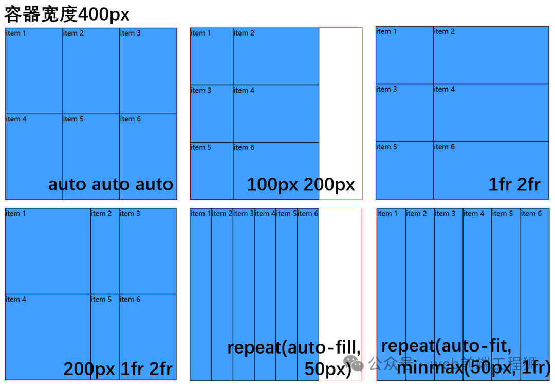 示例:若容器宽度为400px,minmax(50px, 1fr):