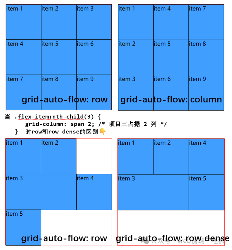 • 当容器足够宽时,auto-fill可能生成多个空列,而auto-fit会让已有的列扩展填满