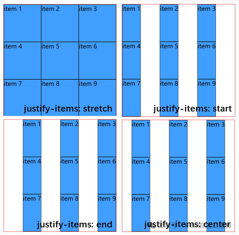 • 与容器的 justify-items / align-items 属性的用法完全一致,但只作用于单个项目