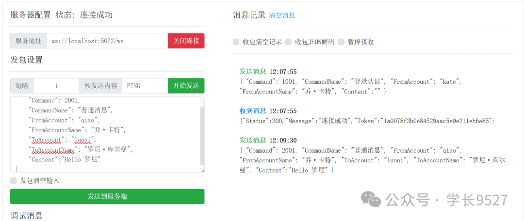 # 根据执行命令来判定具体的操作步骤,比如Command=2001标识单个用户链接{    "Command": 2001,    "CommandName""普通消息",    "FromAccount""qiao",    "FromAccountName""乔·卡特",    "ToAccount""luoni",    "ToAccountName""罗尼·库尔曼",    "Content":"Hello 罗尼"}{    "Command": 2001,    "CommandName""普通消息",    "FromAccount""luoni",    "FromAccountName""罗尼·库尔曼",    "ToAccount""kate",    "ToAccountName""乔·卡特",    "Content":"Hello 乔"}
