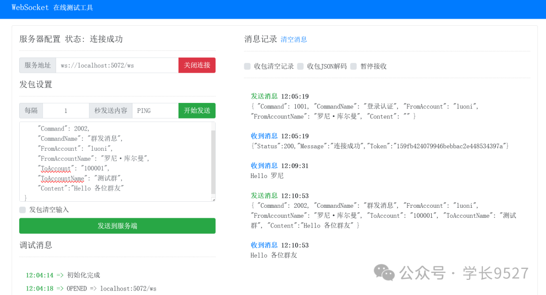 输入ws://localhost:5072/ws测试地址,点击开启连接,提示连接成功后可以开始测试