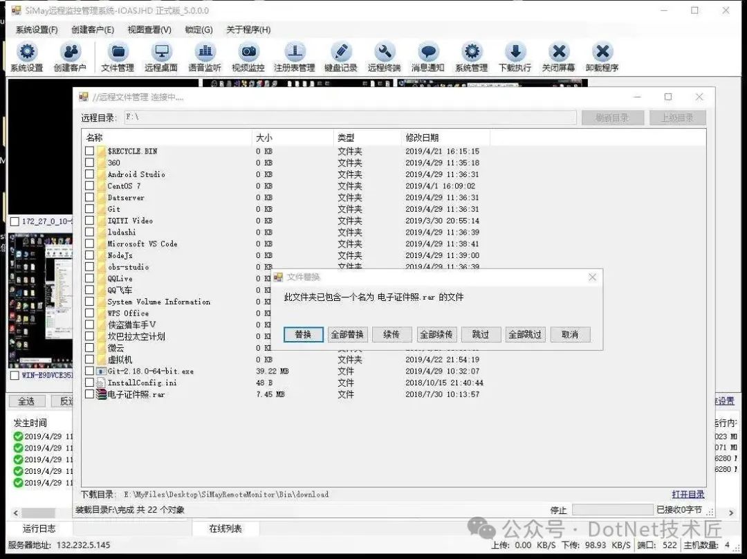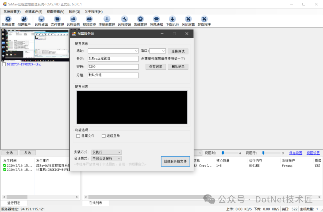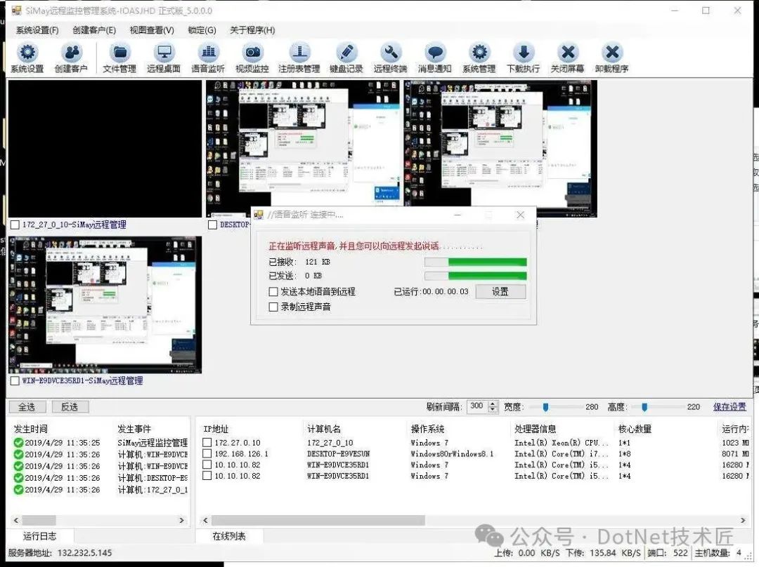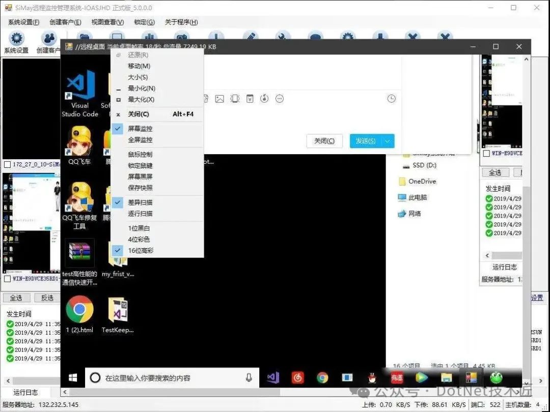 项目技术1、组件式系统架构设计 2、远程同步调用 3、实体消息传输协议 4、应用多连接会话支持 5、可视区域逐行扫描算法的远程桌面 6、中间会话服务转发,支持多个主控端同时实时监控 7、HOOK技术 8、WebSocket Web端监控 9、IOCP异步Socket高性能通信模型 10、基于Windows WaInXX系列实现的语音通讯 11、基于Dx组件捕获摄像头 项目效果在局域网测试环境中,系统可稳定承载1000+并发连接,远程桌面延迟控制在50ms以内。 广域网部署时,通过中间会话服务器转发数据,主控端响应时间增加约30%,但仍满足实时监控需求。 企业定制版文件分发功能在100Mbps带宽下,可实现每秒50MB的传输速率。 ![]() Gitee:https://gitee.com/dotnetchina/SiMayRemoteMonitorOS SiMay远程控制管理系统通过IOCP通信模型、组件化架构和跨平台设计,为远程协作场景提供了高效、安全的解决方案。 其开源特性降低了技术门槛,而企业定制功能则满足了商业化需求。未来,系统计划引入AI异常检测和区块链身份认证等创新模块,进一步拓展应用边界。 #远程控制、#IOCP、#中间会话服务器、#组件化架构、#Web监控、#二进制序列化、#UAC捕获、#企业定制、#开源项目、SiMay、#中间会话、#逐行扫描、#WebSocket、#C#、#Windows 阅读原文:原文链接 该文章在 2025/7/22 17:21:57 编辑过 |