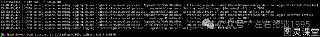 2.查看日志,显示如下即显示成功********每次启动broker时都要关注是否注册到目标nameserver上(name server isworker:9876)