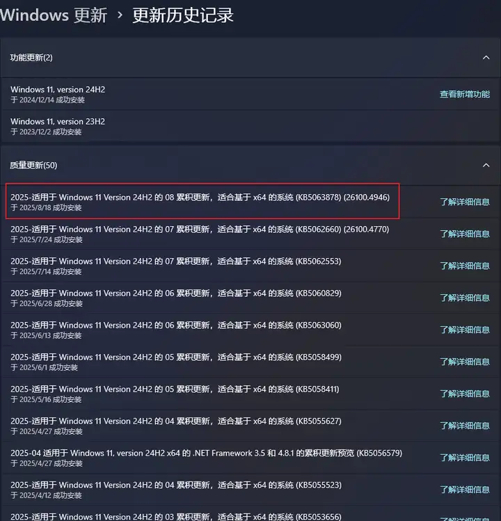 只需更新安装微软发布的紧急更新补丁 KB5066188 ,无需再手动去卸载 KB5063709 / KB5063878补丁。