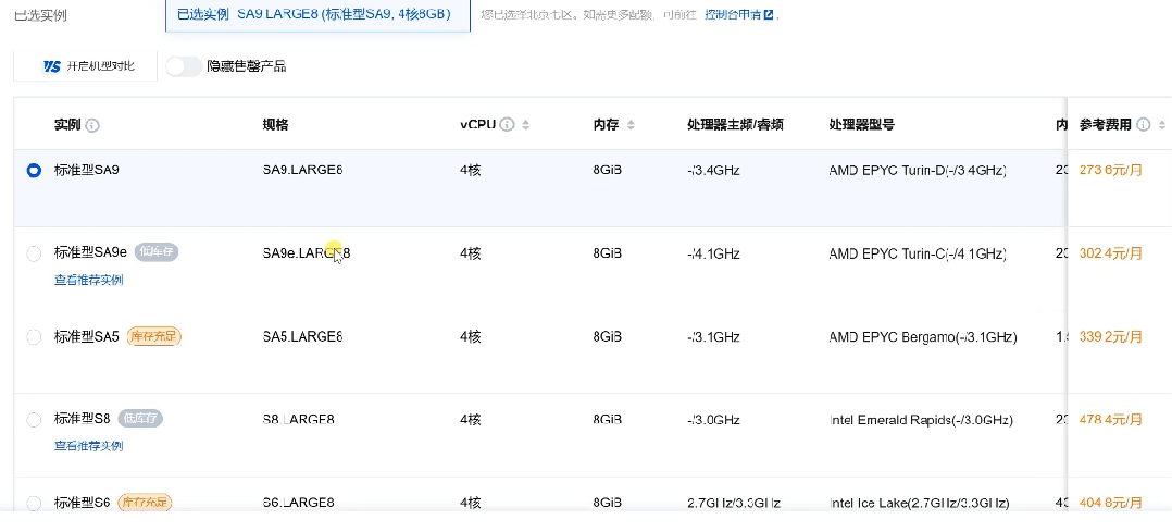 就以腾讯云为例说明,选择4核8G、广州区,可以看到不同型号价格不同,从100元到400元之间不等。