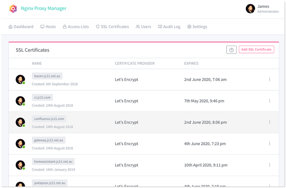 • 自动化 SSL 证书:内置 Let's Encrypt 支持,可以为你的域名一键申请免费 SSL 证书,并且能够自动续期。再也不用操心证书过期的问题了,省心省力。如果你有自己的商业证书,它也支持上传和管理。