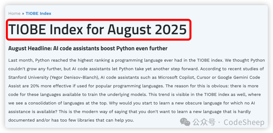 TIOBE 编程社区相信大家都听过,这是一个查看各种编程语言流行程度和趋势的社区,每个月都有榜单更新,每年也会有年度榜单和总结出炉。