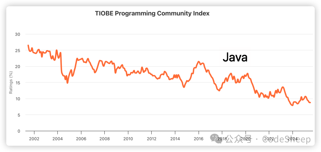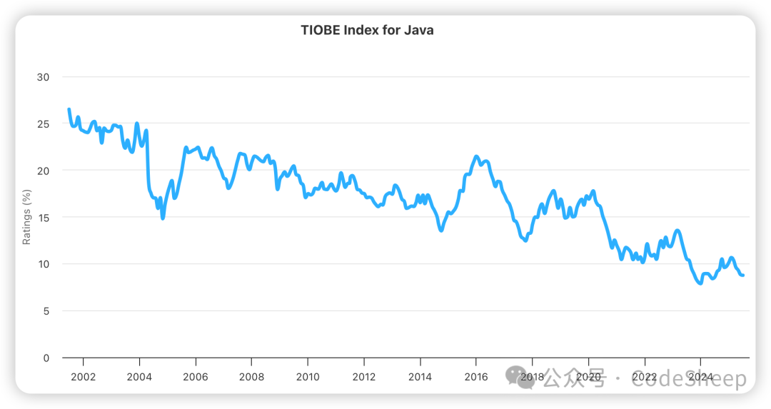 拉了一下最近这二十多年来 Java 的 TIOBE 社区指数变化趋势看了看,情况似乎不容客观。