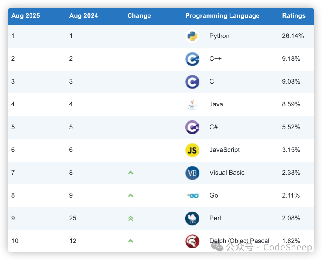 在目前最新发布的 TIOBE Index 榜单中排名前十的编程语言分别是: