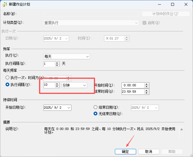 7.  我这里选择十分钟执行一次,点击确定后下一步