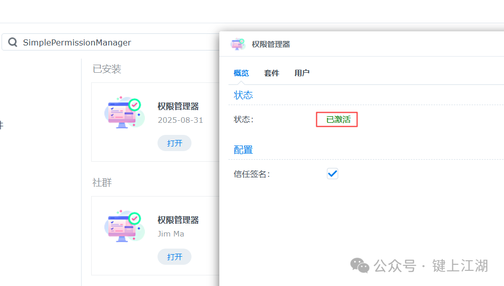 2、选择wireguard安装,安装完成会提示需要root权限,可以按提示任选其一操作,我这里演示安装授权管理器(SimplePermissionManager)套件,这个套件是用于授权哪些需要root权限的应用。
