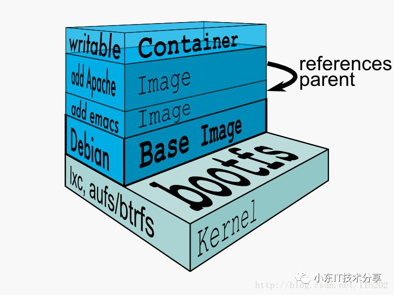 Docker的镜像机制是有层次感的,一个镜像可以放到另一个镜像的顶部。位于下端的为父镜像,以此类推;最底部的镜像可称为基础镜像。