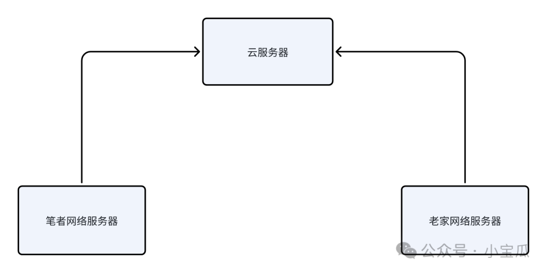 这里面最大的问题就是:要怎么才能方便地登录老家服务器呢?笔者这里的网络和老家的网络都是经过NAT的地址,没有公网IP。经过一番搜索,最终选定使用WireGuard进行异地组网,在老家网络环境放置一台服务器(树莓派),使用一台云服务器作为中转节点(有公网IP地址),笔者所在网络使用一服务器(用于连接中转节点),将三台设备进行组网,笔者所在网络服务器经中转服务器就可以访问老家环境服务器,整个拓扑如下: