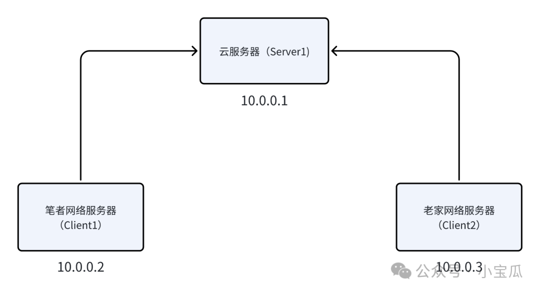 • 云服务器,作用中继节点,代号为:Server1,使用IP地址:10.0.0.1
