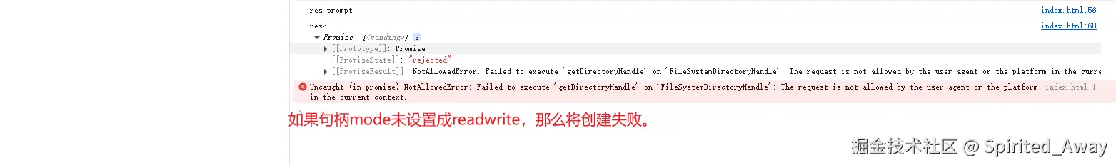 成功选择后,将返回FileSystemDirectoryHandle对象,如果取消(关闭系统弹框或者点击取消)时,将返回一个失败的Promise