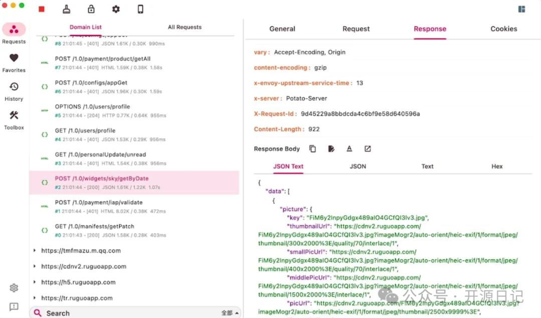 - 流量拦截与实时查看: 支持拦截 HTTP 和 HTTPS 的网络请求,包括 URL、Header、Body 等重要信息一览无余。