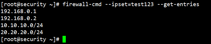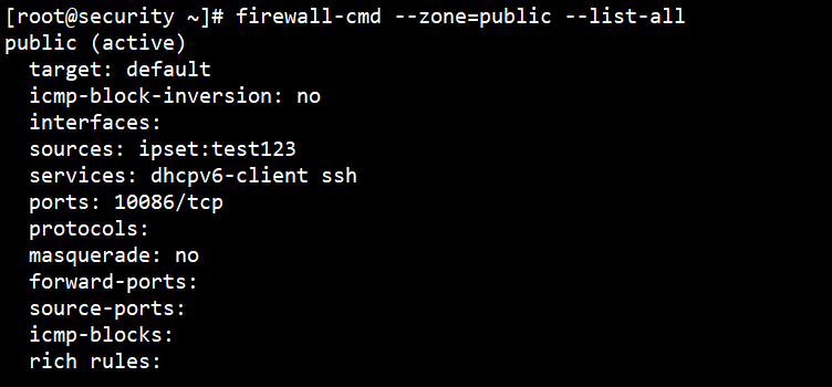 然后使用firewalld --get-ipsets就可以看到 ![]() 看下这个地址组里面有那些地址 ![]() 看看public这个区域的策略情况 ![]() 大家可能也注意到了,我们上述添加策略时只用了一部分参数,例如区域、源地址或者目的端口,那么为啥源地址和源端口不一起用呢,那是因为firewalld默认上同时只支持一个参数的变化,两个参数会造成互斥,不像iptables可以加一条参数,有许多参数,当然firewalld也有办法添加多个参数的策略,那就是“富规则”。 该文章在 2025/9/16 12:04:59 编辑过 |