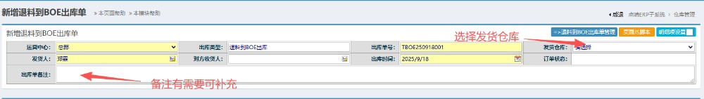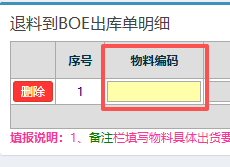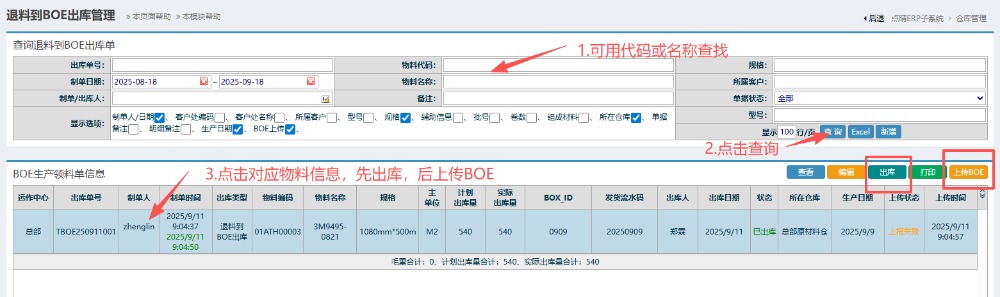 2.进入界面之后,点击选择发货仓库,备注有需要可以补充。 3.接着来到下方点击“物料编码”,会弹出物料信息窗口。 在弹出窗口内,按图操作:点击选择物料大类,点击查询。然后点击对应的物料信息。 注:如果找不到物料信息可输入编号或名称筛选。 4.选好物料后,检查并确认物料信息,根据情况提交选择“制单待退料”或“立即退料” 5.提交后,回到左侧功能菜单找到“退料到BOE出库单管理” 6.进入界面后,按图操作:可用代码或名称查找,点击查询。然后点击对应物料信息,先进行出库,再上传BOE。 流程结束。 点晴模切ERP更多信息:http://moqie.clicksun.cn,联系电话:4001861886 该文章在 2025/9/18 11:41:11 编辑过 |