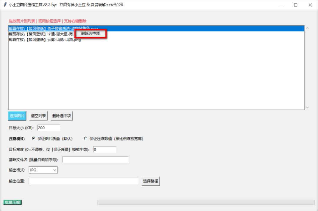 右键可以删除选中项,支持自定义输出路径,提供保证图片质量和保证压缩数值两种压缩模式,支持多种输出格式选择。