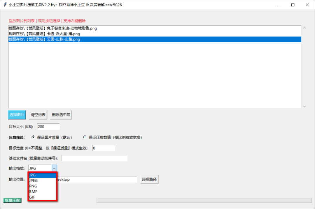 软件由吾爱大佬原创,采用python编写,完全免费,单文件免安装,最大的特点就是支持将图片压缩到指定大小,支持批量压缩,支持拖入添加文件。