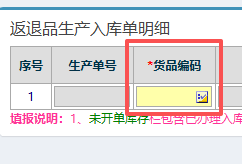 ![]() ![]() 1.进入ERP系统之后,在左侧的功能菜单里找到“BOE定制”,点开“成品返退”,点击“新增返退品生产入库”。 2.进入界面后,按图操作:选择对应的订单子类型(正常返退品、制损品),然后选择对应入库仓库。 ![]() ![]() 3.接下来下方点击“货品编码”,会弹出物料信息窗口。 在弹窗的物料信息窗口内,选择订单来源,点击查询。然后点击对应物料信息。 4.选好物料之后,先对订单上的质量状态进行选择:“合格品”或“制损品”