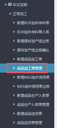 1. 进入ERP系统之后,在左侧的功能菜单里找到“BOE定制”,点开“正常加工”,点击“新增成品加工单”。