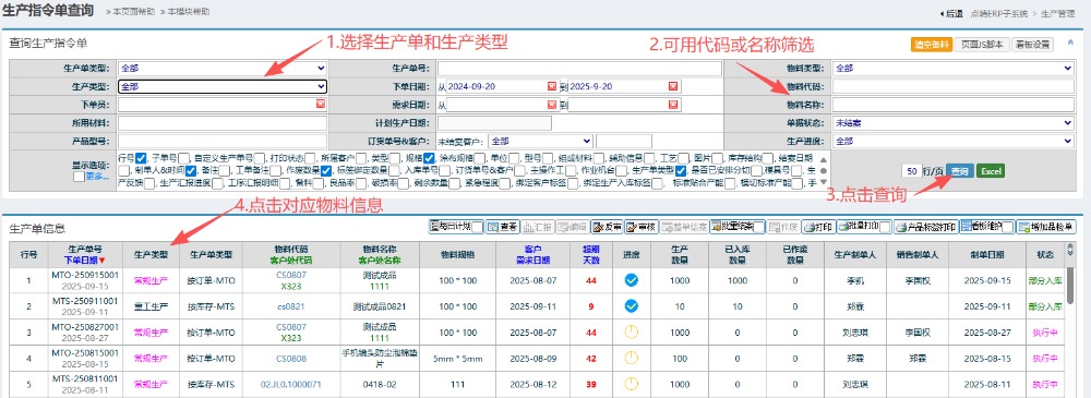 6.进入界面后,按图操作:选择生产单类型,可用代码或名称筛选。点击查询确认当前生产单类型