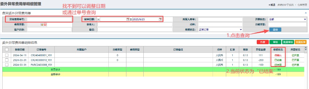 6.进入界面后,点击查询。如果找不到可以调整日期或者根据异常费用单号查询
