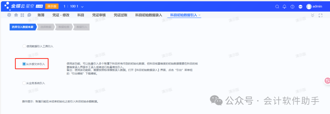 (2)科目初始数据引入:财务会计→总账→初始化→科目初始数据引入;a:先点击科目初始数据录入界面,点击引出按钮下的引出模版;(有核算维度的初始数据需要在科目的核算维度录入界面手工录入或者进行批量填充引入)b、打开财务会计→总账→初始化→科目初始数据引入页签,选择从外部文件引入,点下下一步选择相应的文件,引入即可;(3)科目初始数据引入-从业务系统引入:点击科目初始数据引入,选择从业务系统引入,然后选择相应的业务系统名称,最后引入;(1)财务会计→总账→初始化→总账初始化;点开总账初始化,选择相应的账簿,点击结束初始化;