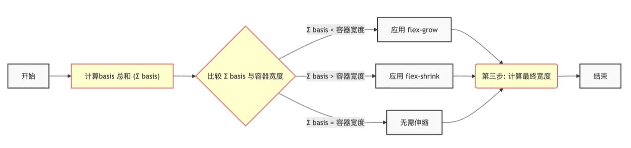 • 空间不足时,压缩空间:系统根据flex-basis和flex-shrink共同决定的权重分梭压缩量