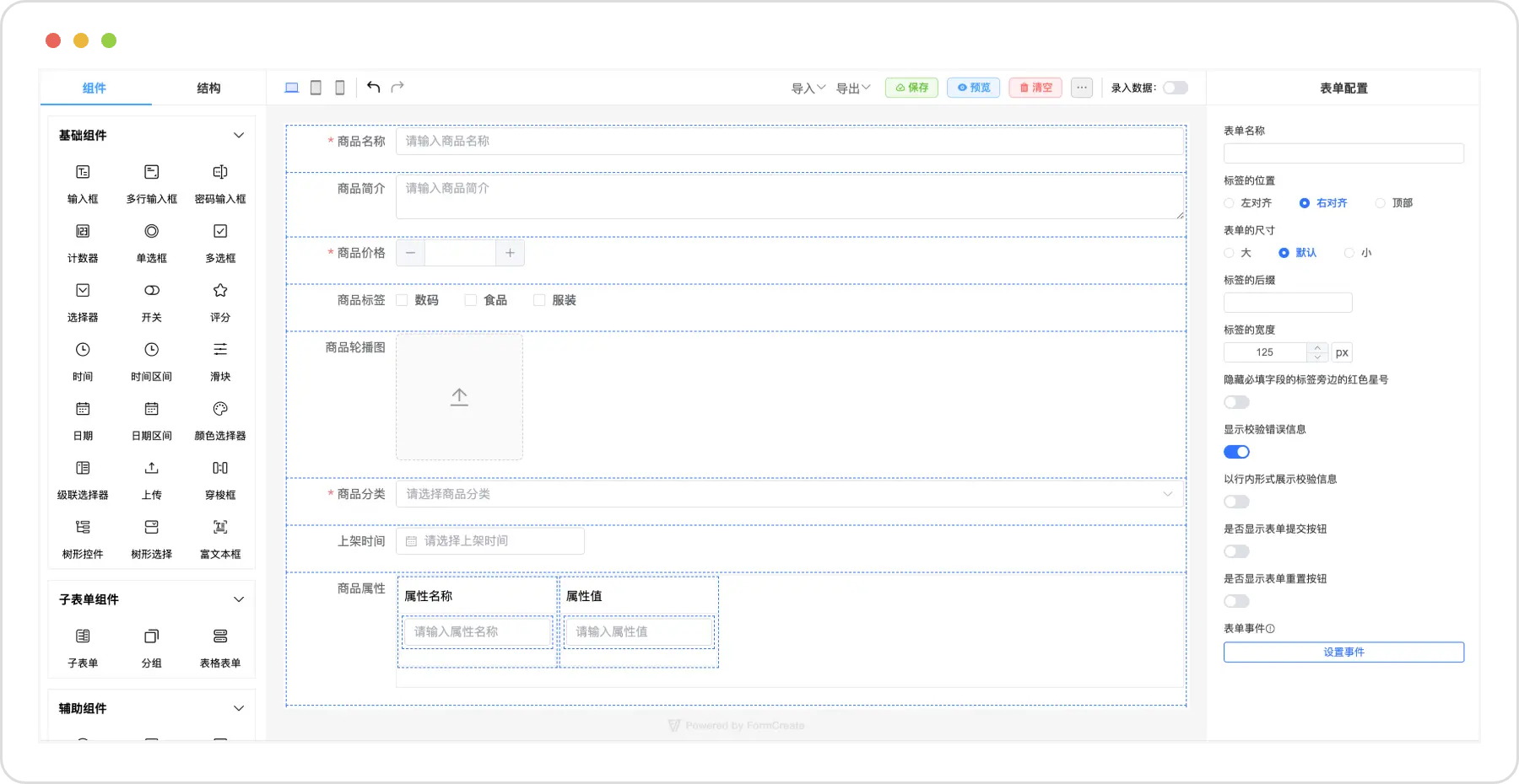 • 表单大纲、操作记录、数据录入、组件生成、事件配置、表单验证、栅格布局、表格布局等。