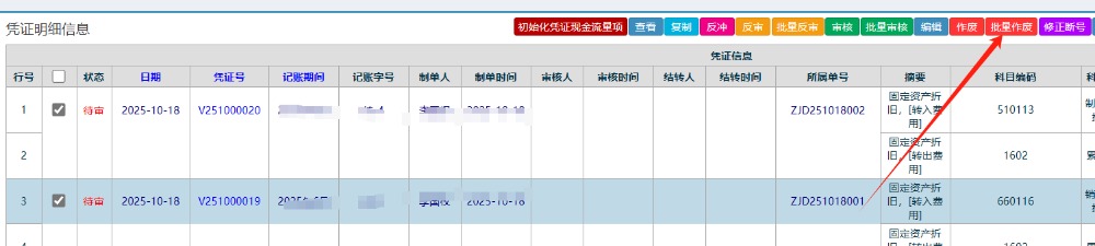 勾选上要作废的凭证,再点击批量作废按钮