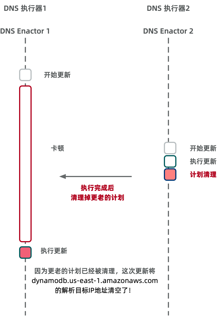 当第二台(较快的)DNS 执行器完成端点更新后,它启动了方案清理进程,该进程会删除所有比刚应用方案“陈旧得多”的旧方案。恰在此时,第一台(较慢的)DNS 执行器终于将其早已过期的方案应用到了 DynamoDB 的区域主端点,结果把较新的方案覆盖掉了。由于该执行器在开始应用时所做的新旧方案校验因长时间延迟而变得过期无效,所以未能阻止旧方案覆盖新方案。随后,第二台执行器的清理进程检测到这个过期方案(相对于它刚应用的方案已过多代),便将其删除。随着这一方案被删除,该区域端点的所有 IP 地址也从 DNS 记录中被移除了。而且由于活动方案被移除,系统陷入不一致状态,导致之后无论哪台 DNS 执行器都无法再成功应用新的方案。最终,我们不得不通过人工干预来纠正这一状况。