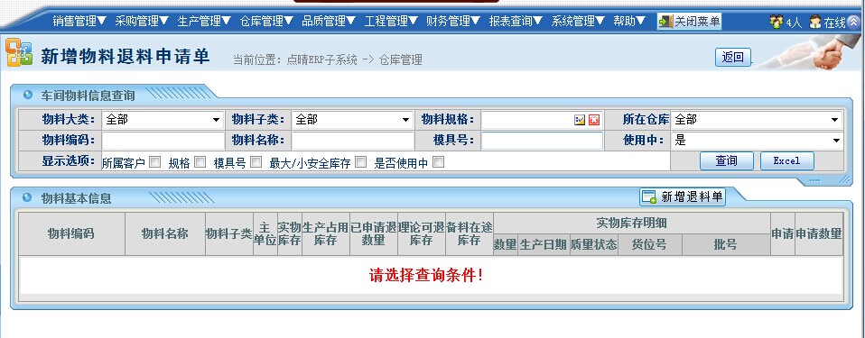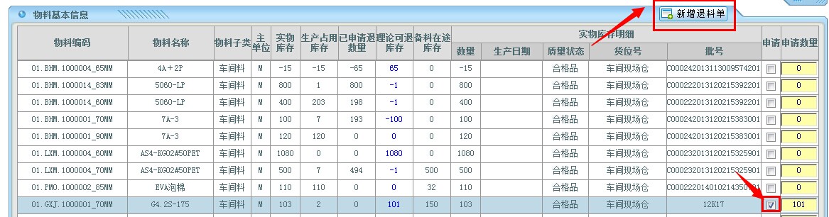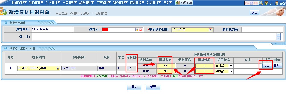 按照实际生产剩余数量填写单据信息(退料长度的总和大于或者小于退料数的总长度均可,资料填写完点提交即可。如下图: